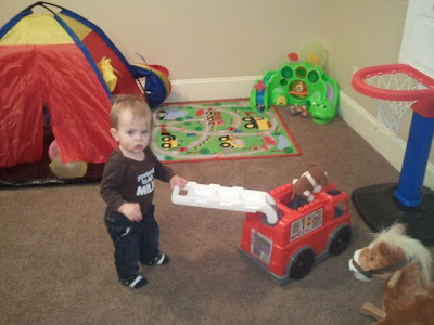 One of the toys she brought is a big fire truck. It comes with blocks, which he plays with but his favorite part is that he can pull and push it around.